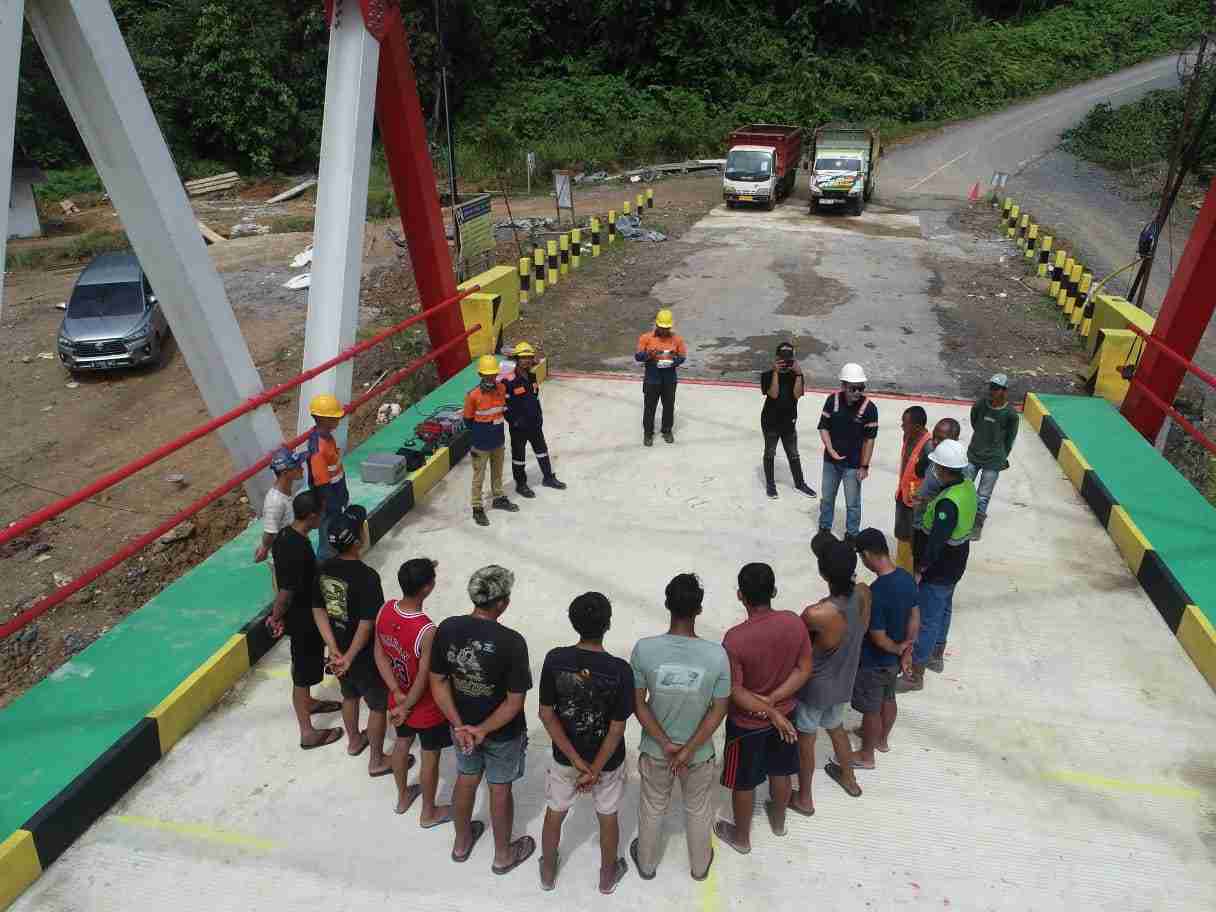 Toolbox Meeting HSE Operasional Pengarahan aspek keselamatan kerja dan mitigasi risiko operasional oleh senior engineer guna menjamin kelancaran siklus pembebanan statis jembatan. |