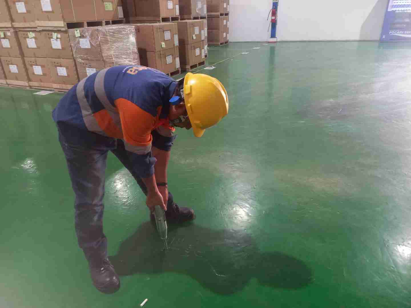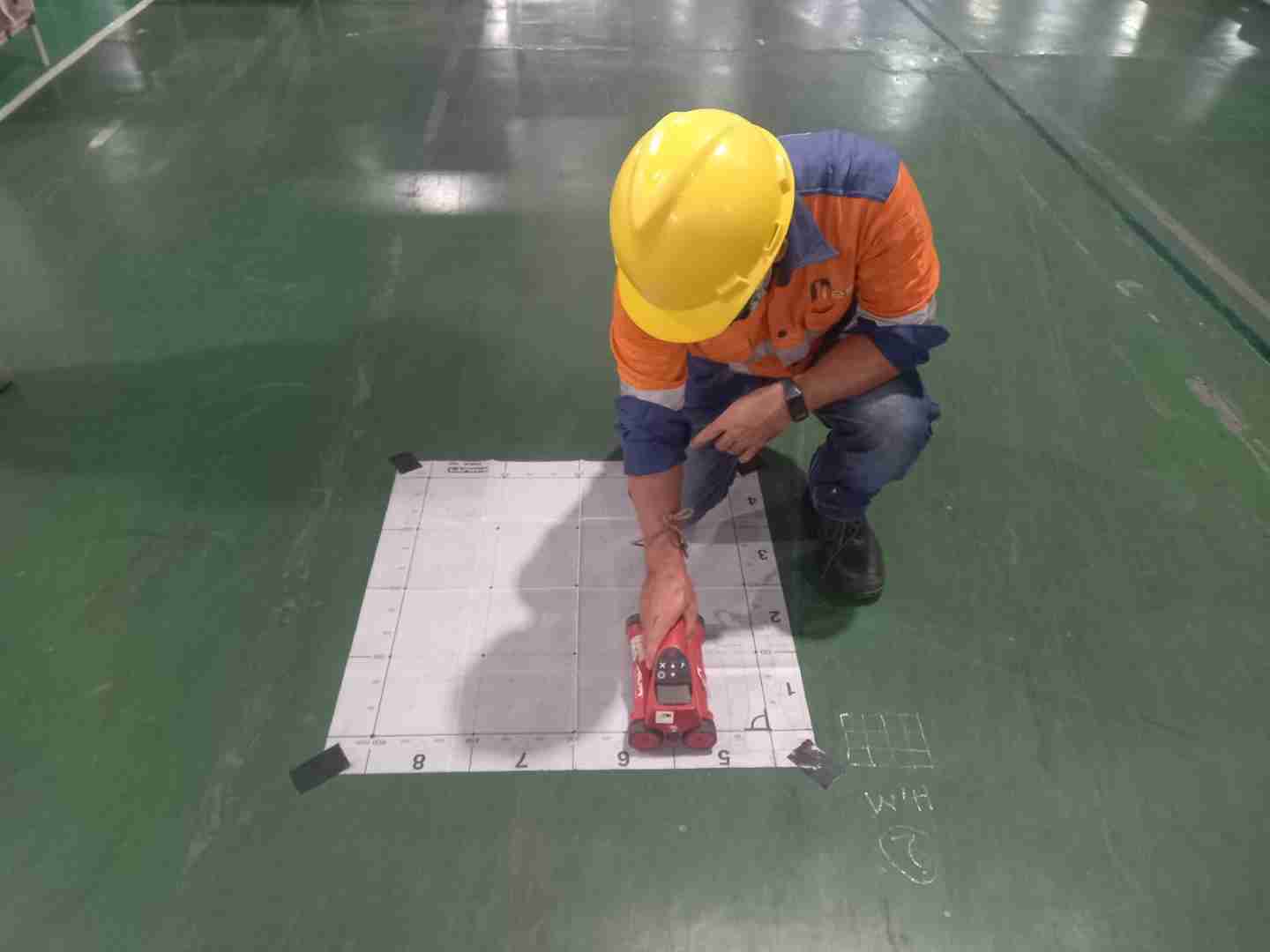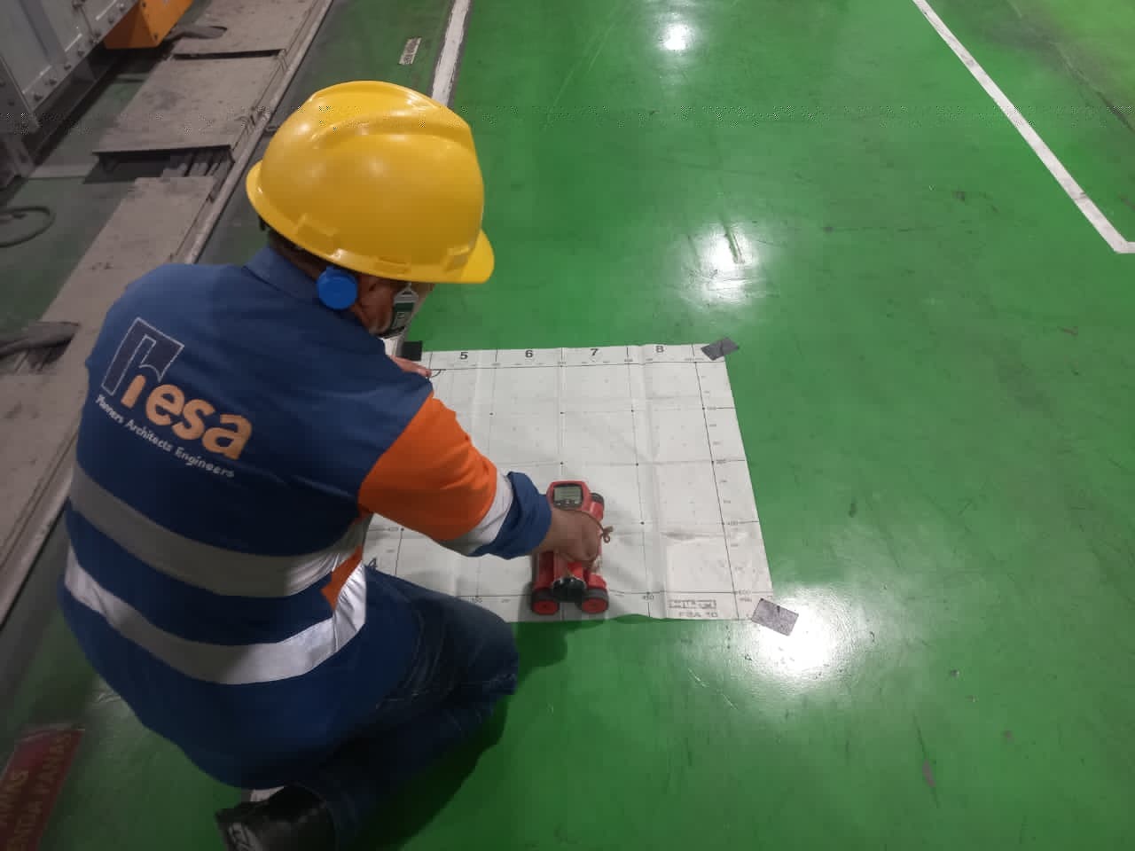 Pekerjaan Hammer Test & Rebarscanning Lantai Warehouse di Cikarang pada lantai *warehouse* di Cikarang dilaksanakan sebagai bagian dari kendali mutu konstruksi yang ketat. Sebagai partner teknis, tim HESA memastikan instrumen yang digunakan telah terkalibrasi guna menjamin akurasi data pemindaian tulangan dan angka pantul yang dihasilkan. Investigasi lapangan ini merupakan prosedur rutin untuk mendokumentasikan kondisi material in-situ sesuai permintaan pemberi tugas.