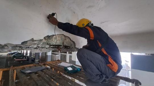 - Pengambilan Sampel (Core Drill): Proses pelubangan dilakukan secara presisi untuk mengambil sampel beton inti berdiameter tertentu. Metode ini memberikan data visual langsung mengenai ketebalan pelat dan kondisi internal beton (homogenitas).