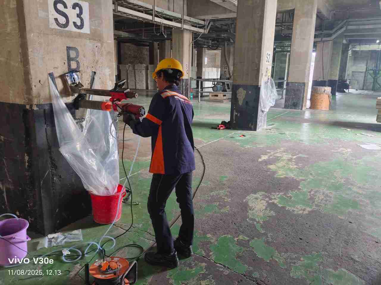 Pembersihan lubang dari sisa lumpur beton. Lubang uji segera diisi dengan Non-shrink Grout untuk mencegah diskontinuitas pada pelat lantai dan memastikan area kembali dapat dilalui beban operasional.