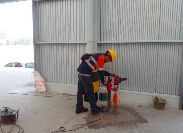 Prosedur pengujian diawali dengan Hammer Test untuk mendapatkan gambaran awal uniformitas beton secara non-destruktif. Guna memverifikasi hasil tersebut, dilakukan Concrete Coredrill untuk mengambil sampel fisik yang mewakili kondisi internal struktur. Sampel core tersebut kemudian diuji di laboratorium beton (Crushing Test) untuk menentukan nilai kuat tekan karakteristik beton secara empiris sesuai standar operasional pengujian.
