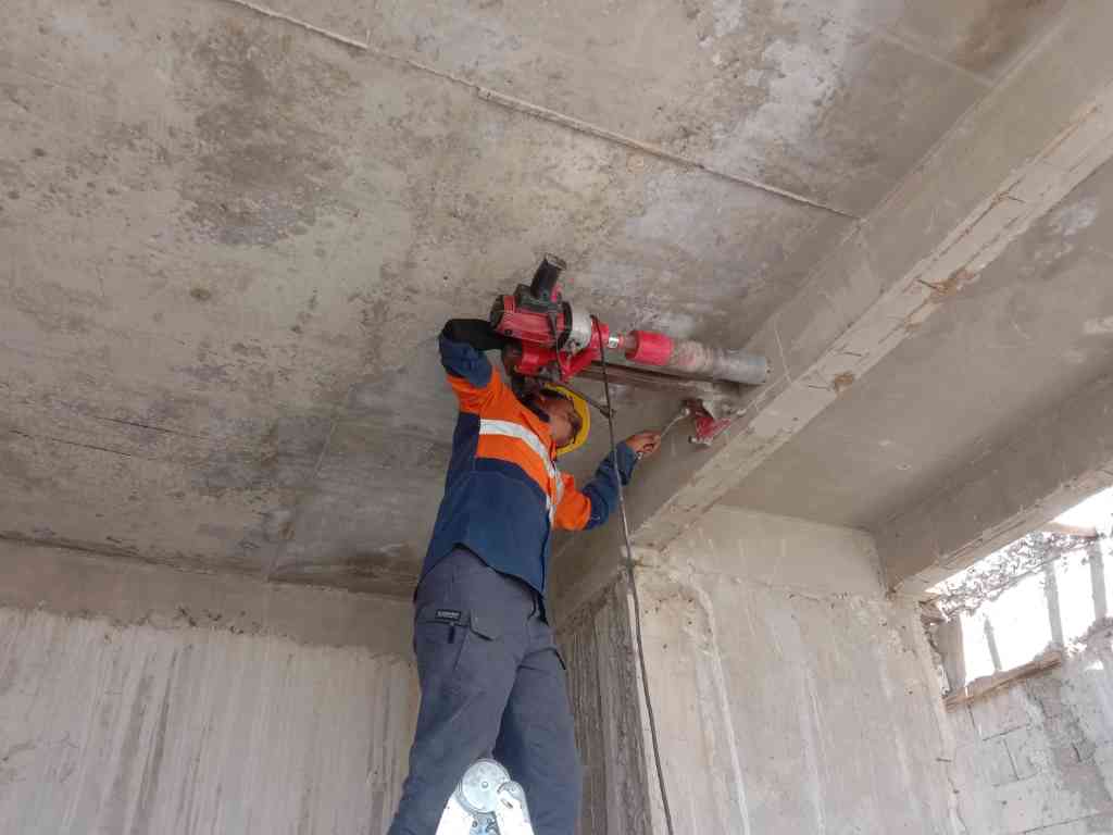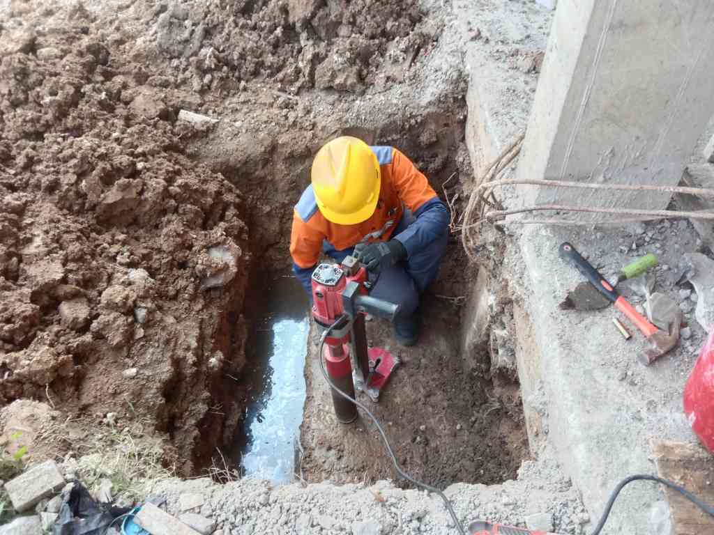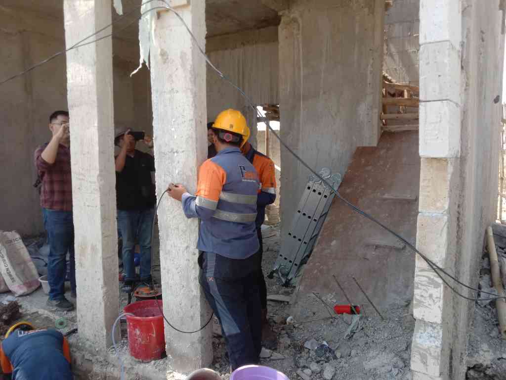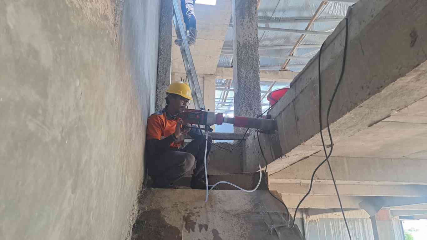 Pengambilan sampel beton menggunakan mesin Diamond Core Drill untuk spesimen silinder aktual guna pengujian kuat tekan lab.