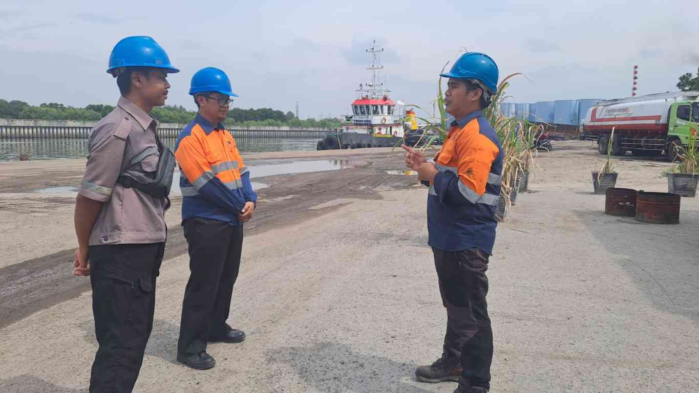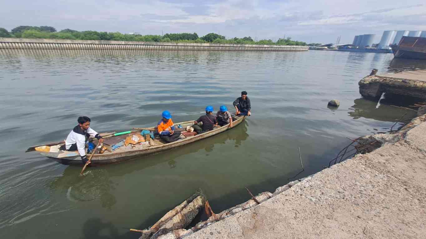Toolbox Meeting Koordinasi aspek K3L di area tanggul laut sebelum memulai investigasi fonfasi. |