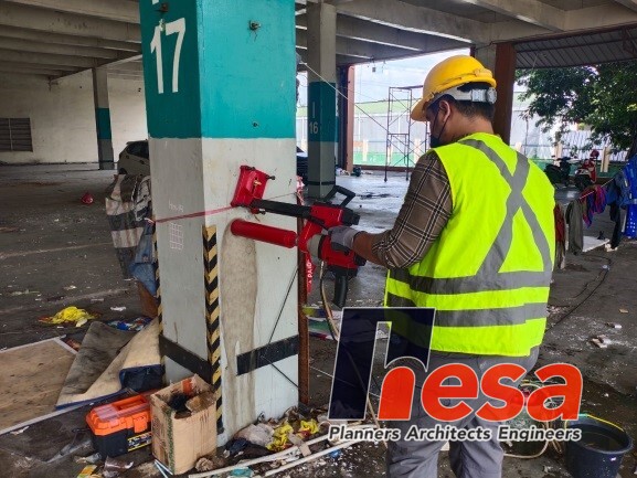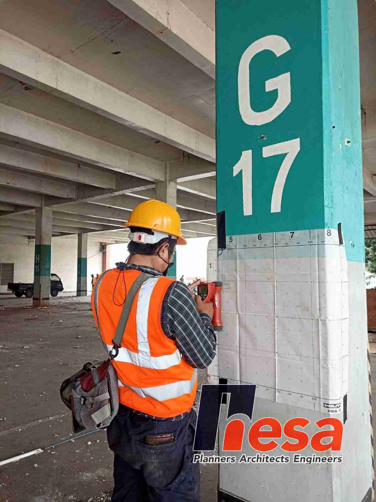 Hammer Test: Mengukur kekerasan permukaan beton dengan menempatkan plunger rebound hammer - Ground Penetrating Radar (GPR untuk deteksi subsurface) — Scanning di basement area untuk deteksi void/delamination di bawah pilecap, anomali tanah, atau perubahan densitas