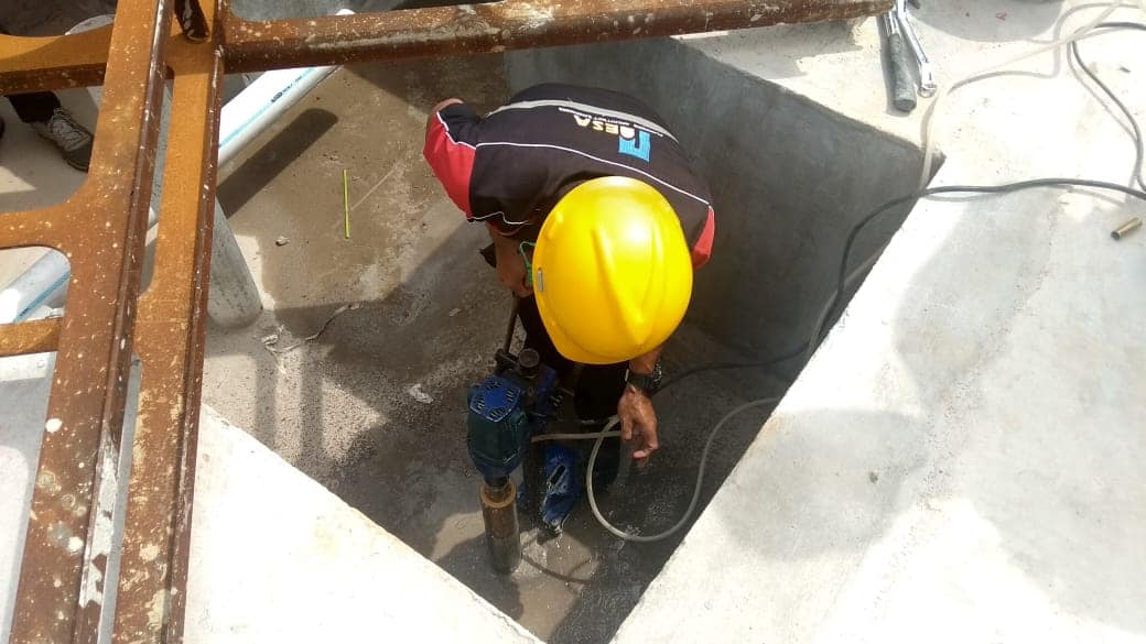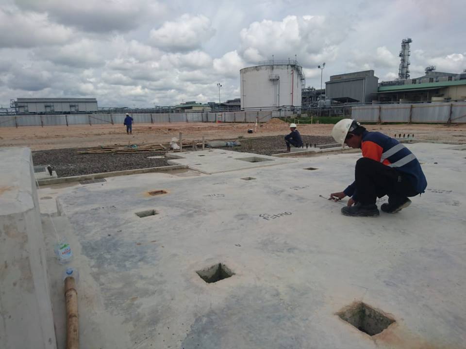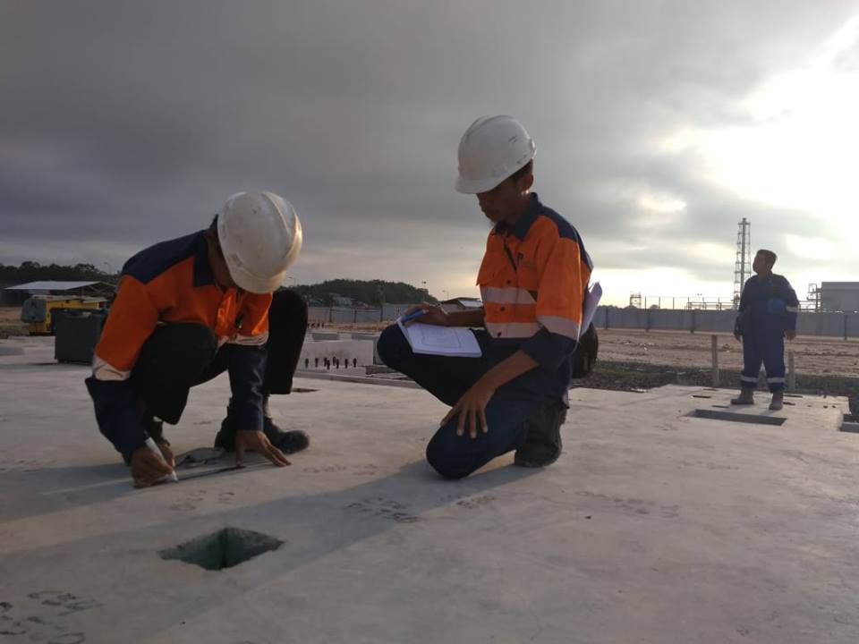 Pengujian nondestructive test pada bangunan Betara Gas Plant milik PetroChina International Jabung Ltd untuk memeriksa kemungkinan adanya retak struktur pada elemen beton.