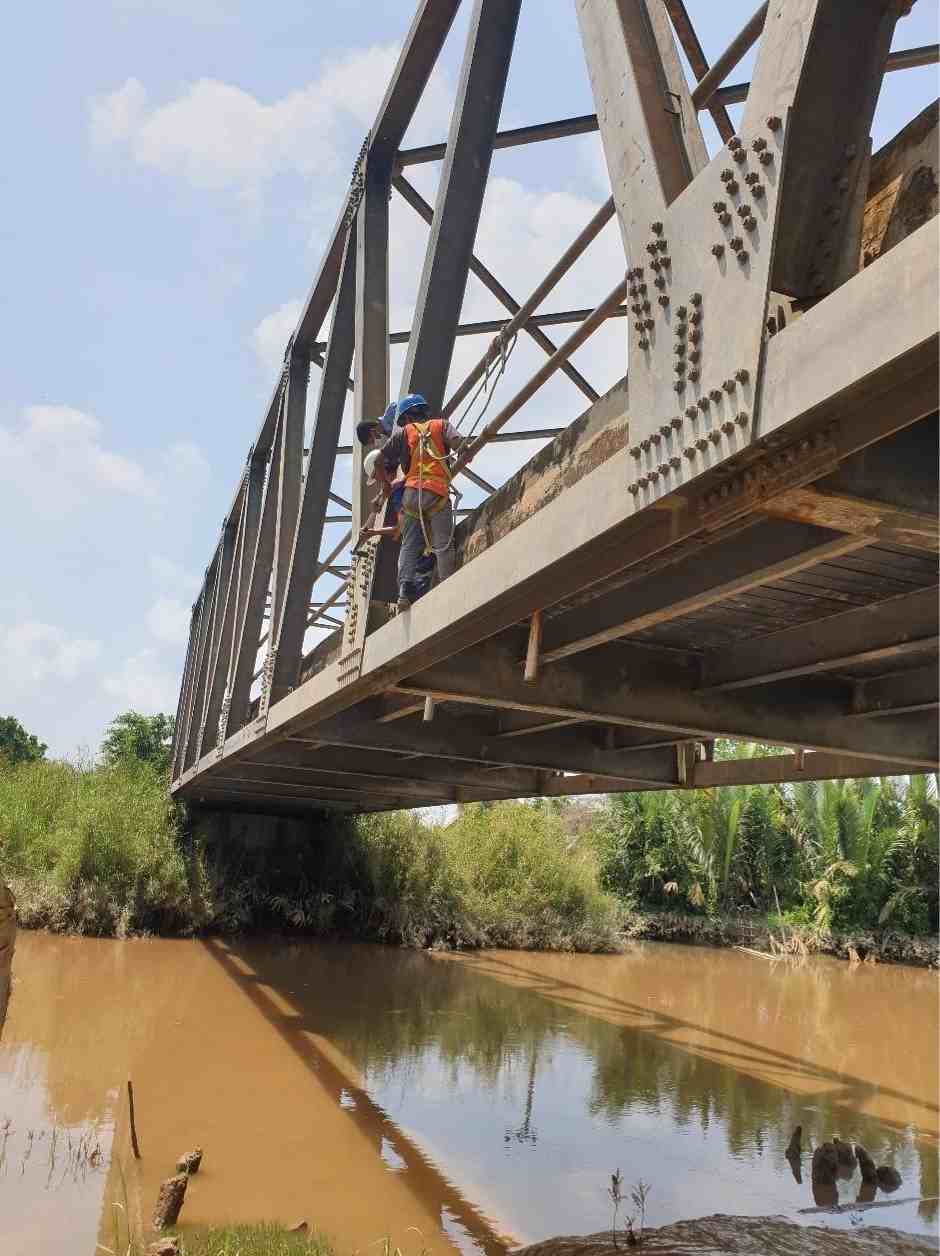 | Catatan Pengalaman HESA | Pada jembatan di area perkebunan dengan sistem komposit dan rangka (truss), potensi kelelahan material dan korosi akibat lingkungan tropis perlu ditinjau setelah masa operasi berjalan. Pengujian NDT dan loading test digunakan untuk memverifikasi kapasitas struktur eksisting sebagai dasar penilaian load rating sebelum penentuan solusi desain pengganti yang sesuai dengan beban operasional aktual. | |