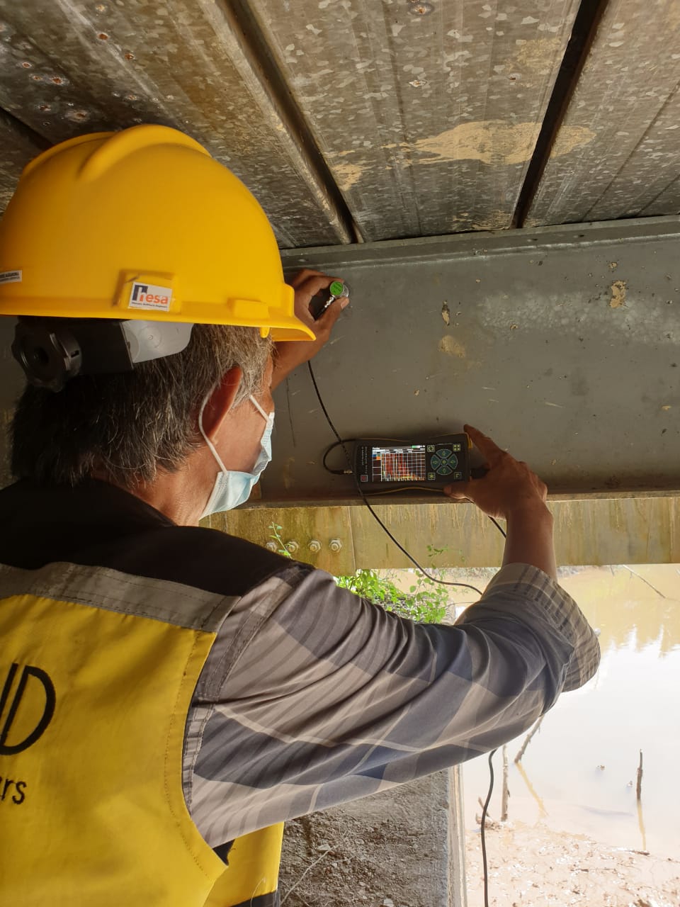 Pendekatan multi-metode mencakup NDT (Hammer Test, UPVT, Pulse Echo, Brinell, Ultrasonic Thickness, Bolt Torque, Carbonation Test), Destructive Test (Core Drill), dan Bridge Loading Test (Static & Dynamic), dilanjutkan desain struktur jembatan pengganti. Proses komprehensif ini bagian dari evaluasi infrastruktur perkebunan kritis untuk dasar pengambilan keputusan teknis.
