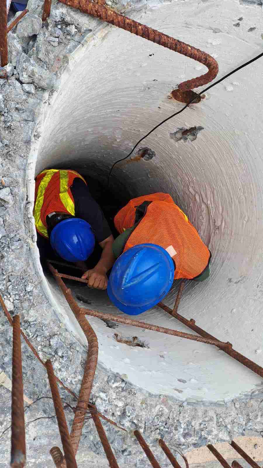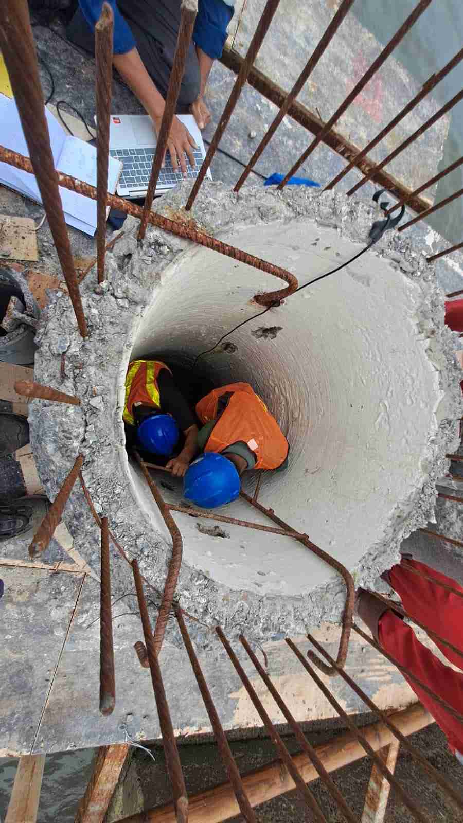 Data Acquisition – Point 2 Pengulangan prosedur pada tiang kedua guna memastikan konsistensi kualitas beton fondasi. |