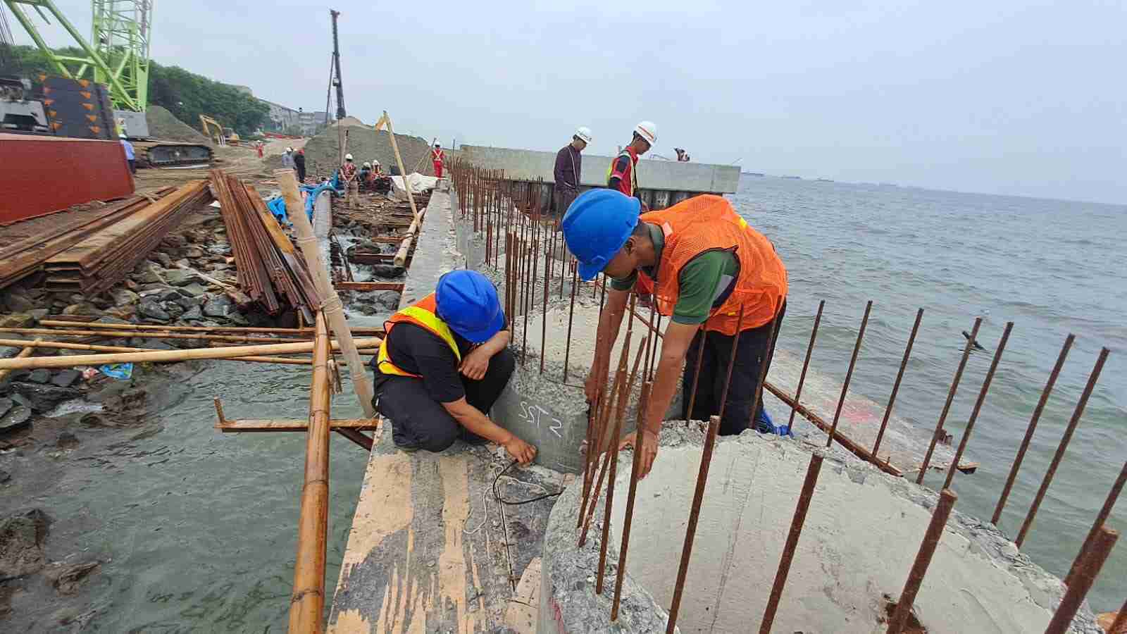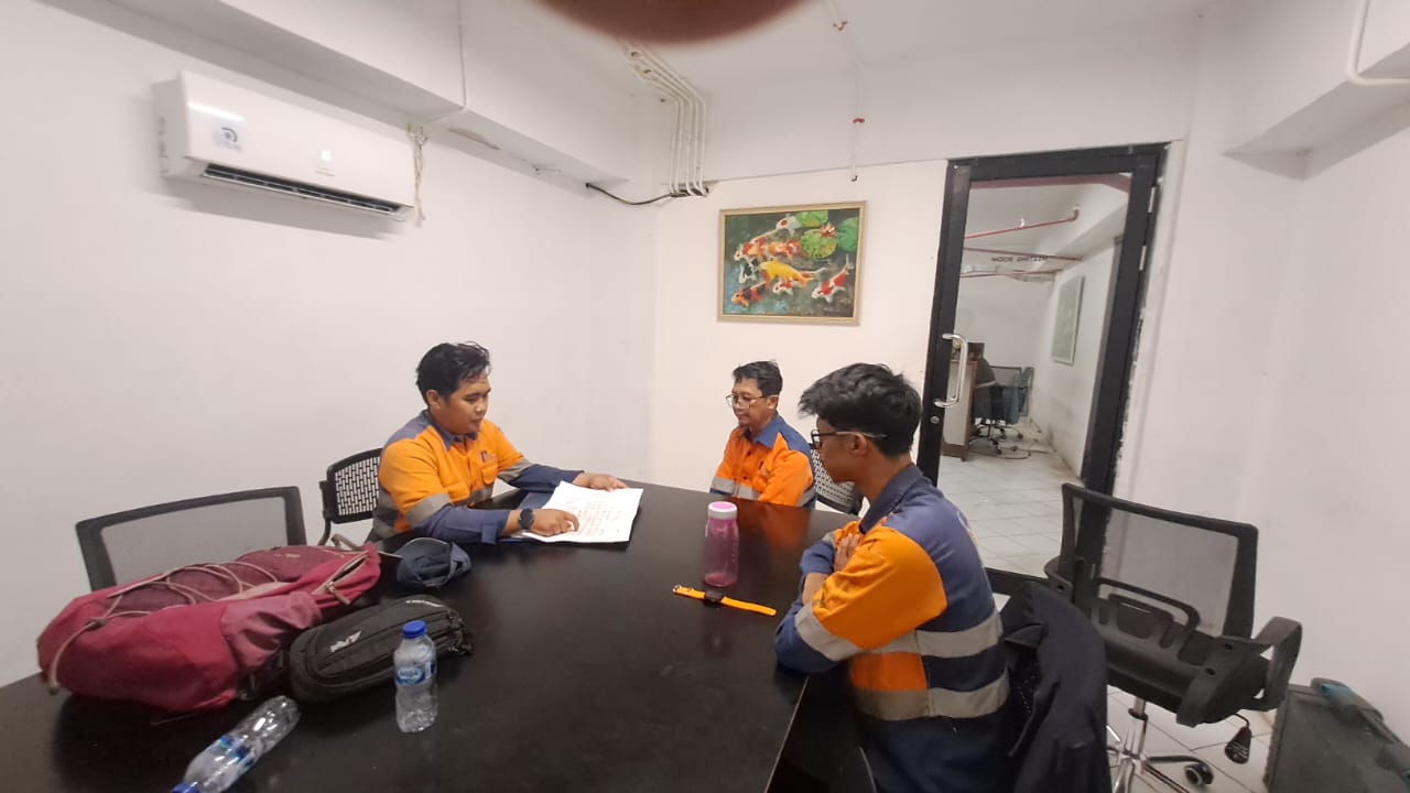 Toolbox Meeting Koordinasi aspek K3L di area tanggul laut sebelum memulai investigasi fonfasi. |