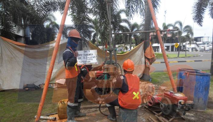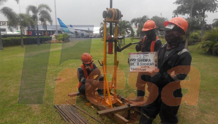 Pengeboran tanah dilakukan untuk mendapatkan drilling log stratifikasi tanah, pengambilan sampel tanah tak terganggu (undisturb sampling) dan pengujian Standard Penetration Test (SPT), untuk mendapatkan daya dukung tanah dan properti tanah — at Bandara Internasional Soekarno Hatta.